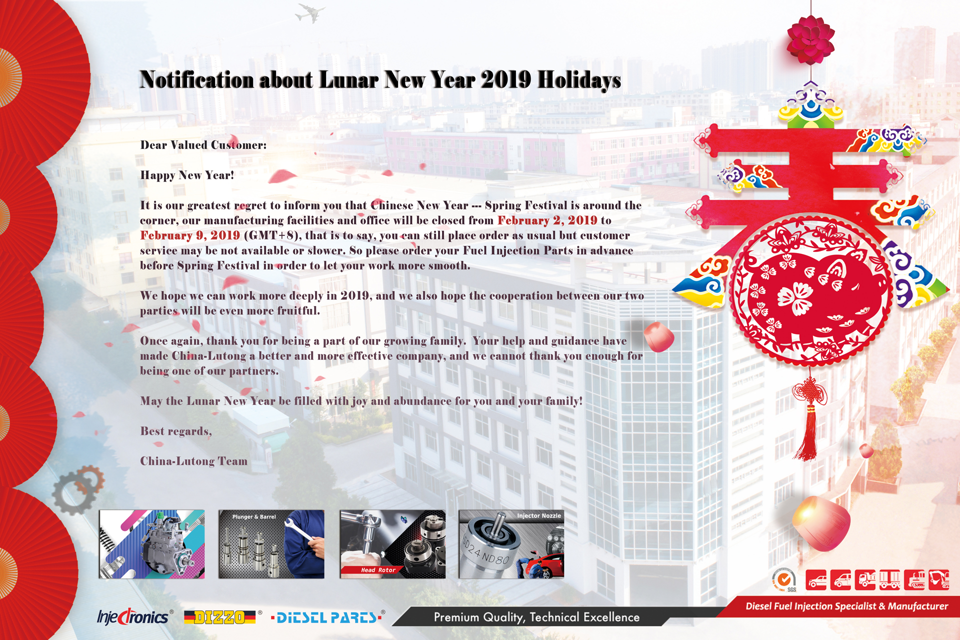 more..China-Lutong will observe holiday on from February 02, 2019 to February 09, 2019. As a result, there’ll be a delay in our support service during that time.